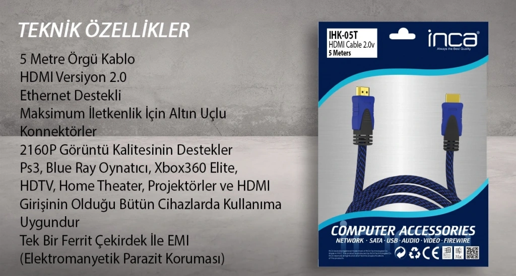 INCA IHK-05T 5 Mt 2.0V 4K& 2K & FULL HD HDMI Kablo